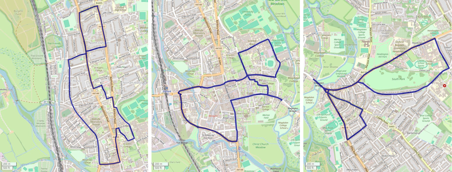 To ensure representative data, three main loops were recorded in Oxford, each with diverse infrastructure types, traffic volumes, and environments. The route selection was guided by stakeholder input from Transport for London (TfL), Oxfordshire County Council (OCC), and local cycling communities, alongside analysis of accident data from the UK’s CrashMap (2019–2022) and findings from a prestudy survey of Oxford cyclists that identified safety-critical intersections and perceived-safety concerns. Each route was traversed multiple times in both directions, totaling 12 runs, recorded under various weather, lighting, and traffic conditions.